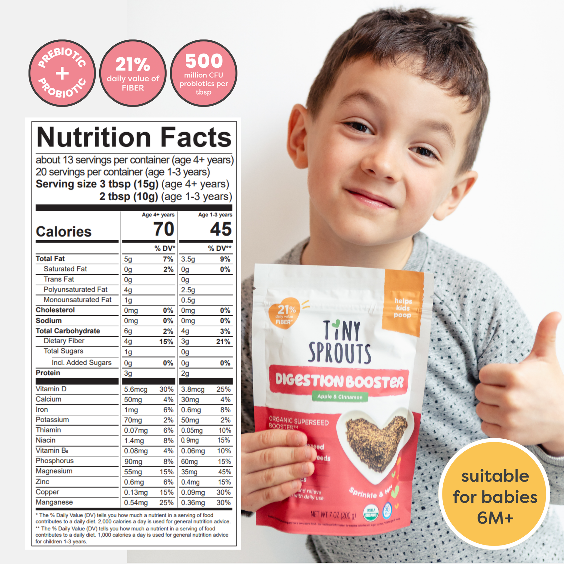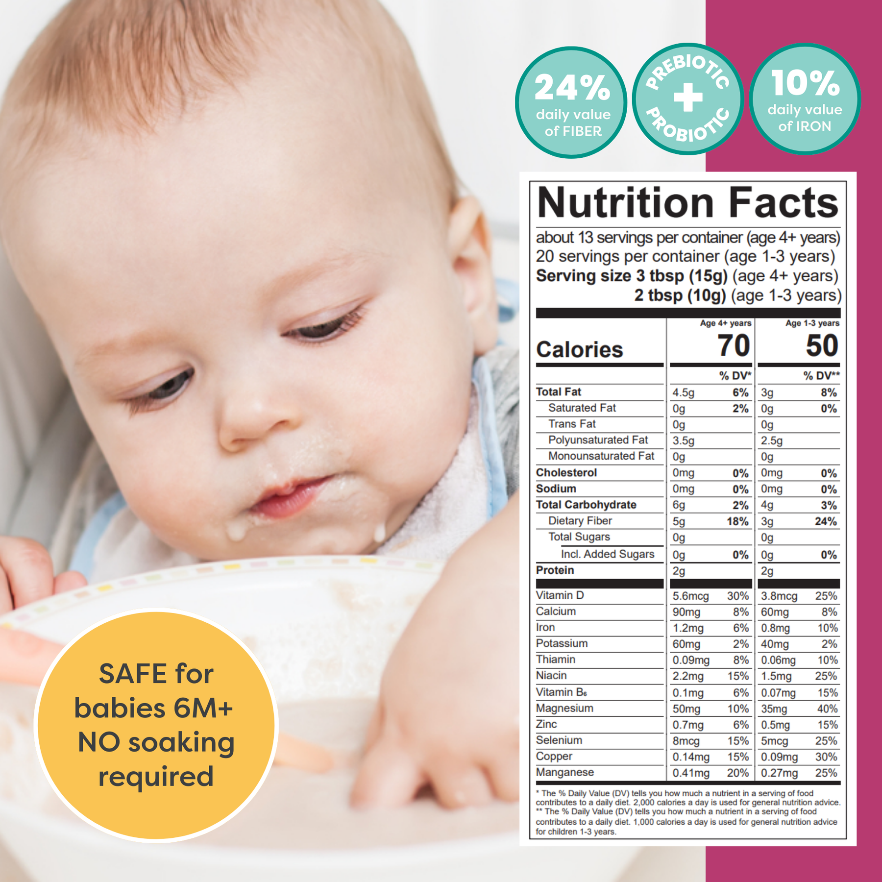 Yes—all our boosters are safe for babies 6 months and up, who have started solids. It’s made with simple, organic whole food ingredients and contains no fillers, sweeteners, or additives, making it a gentle and nourishing choice for little ones. For babies 6–12 months, we recommend up to 1 tablespoon per day. As with any new high-fiber food, it’s best to start with a small amount and increase gradually to support healthy digestion.
