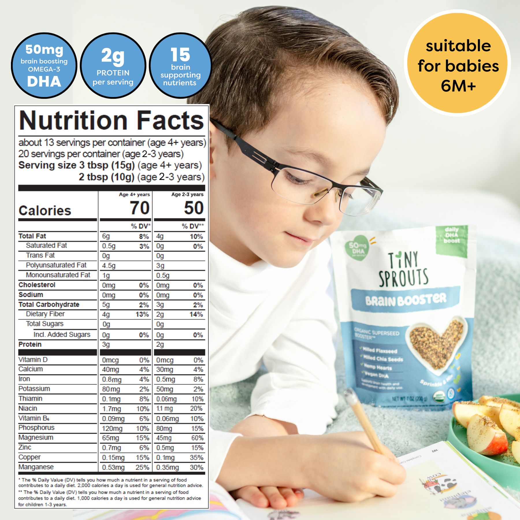 Yes! Brain Booster is made from whole food ingredients and offers more than just omega-3s—it also provides nutrients like fiber, antioxidants, and plant-based support for brain, eye, and nervous system development. Even if your child takes an omega-3 supplement, Brain Booster can complement it with a more complete, food-first approach. If you're concerned about overlapping nutrients, you can always adjust the serving or check with your pediatrician.