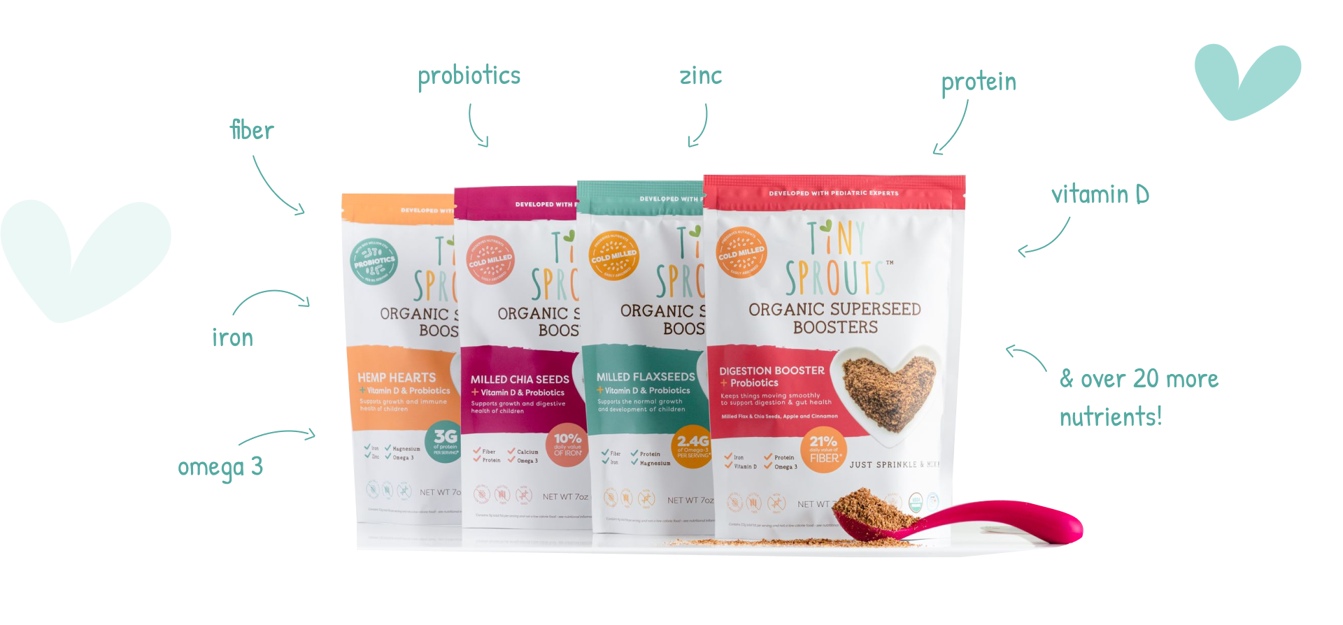 Tiny Sprouts Organic Superseed Boosters are cold-milled & hulled for easy digestion and maximum nutrient absorption in little bodies. Each unique blend is fortified with vegan vitamin D & probiotics, which are essential to the health & well-being of children.