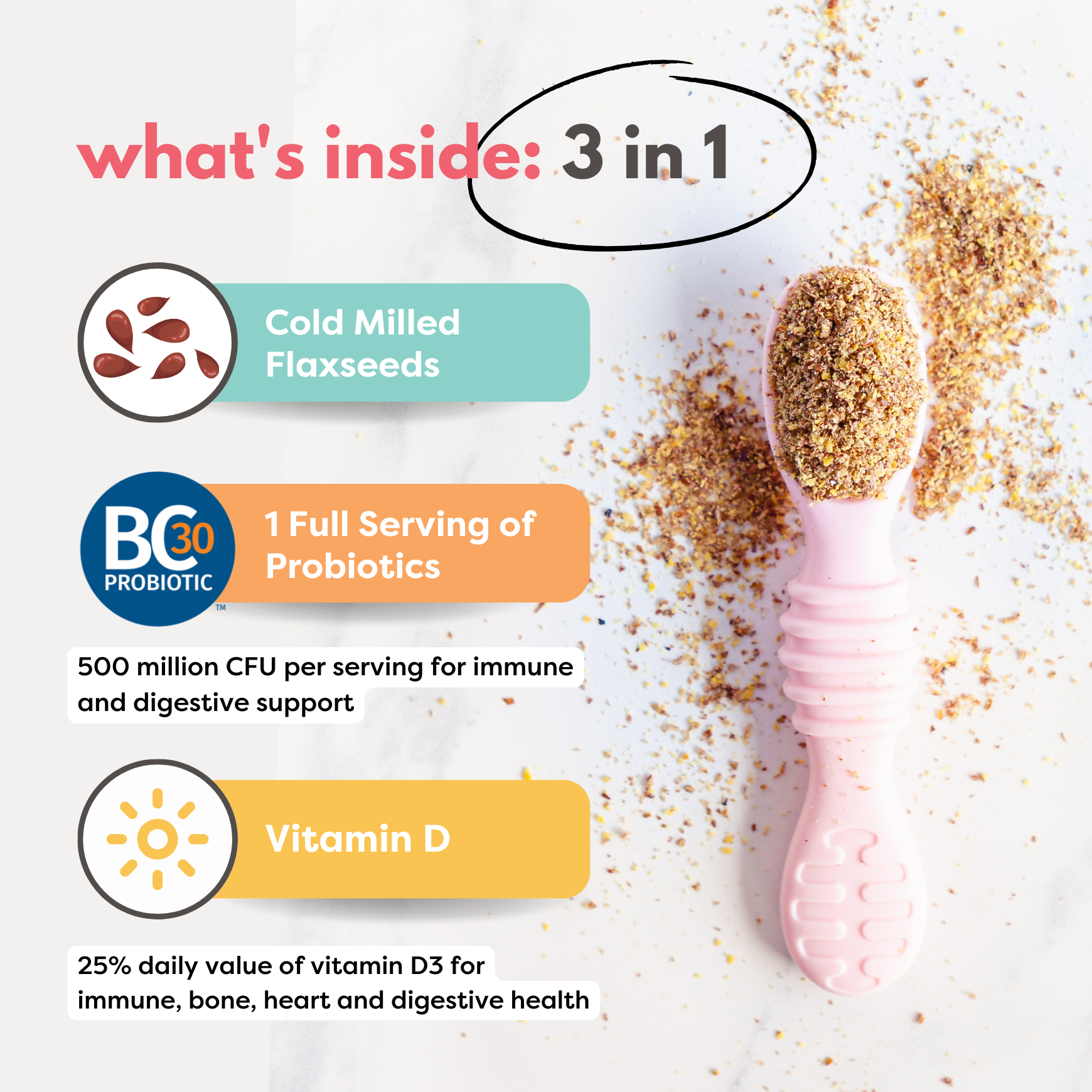 "This flaxseed booster has been a lifesaver for my toddler’s digestion. I just sprinkle it into yogurt or pancakes and she gets fiber, probiotics, and vitamin D without even noticing! It's so nicely ground up and that makes it an easy mix into anything."