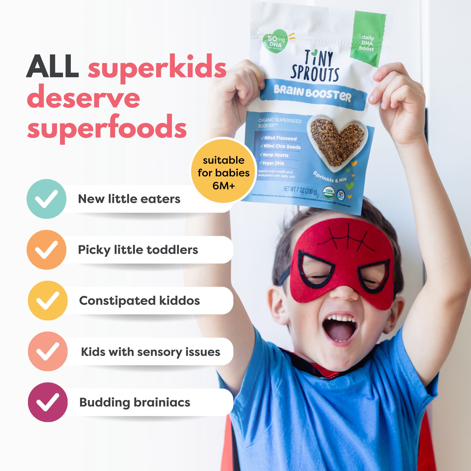 Tiny Sprouts Brain Booster + Omega-3 DHA is made with nature's most nutrient dense superfoods and research backed functional ingredients.